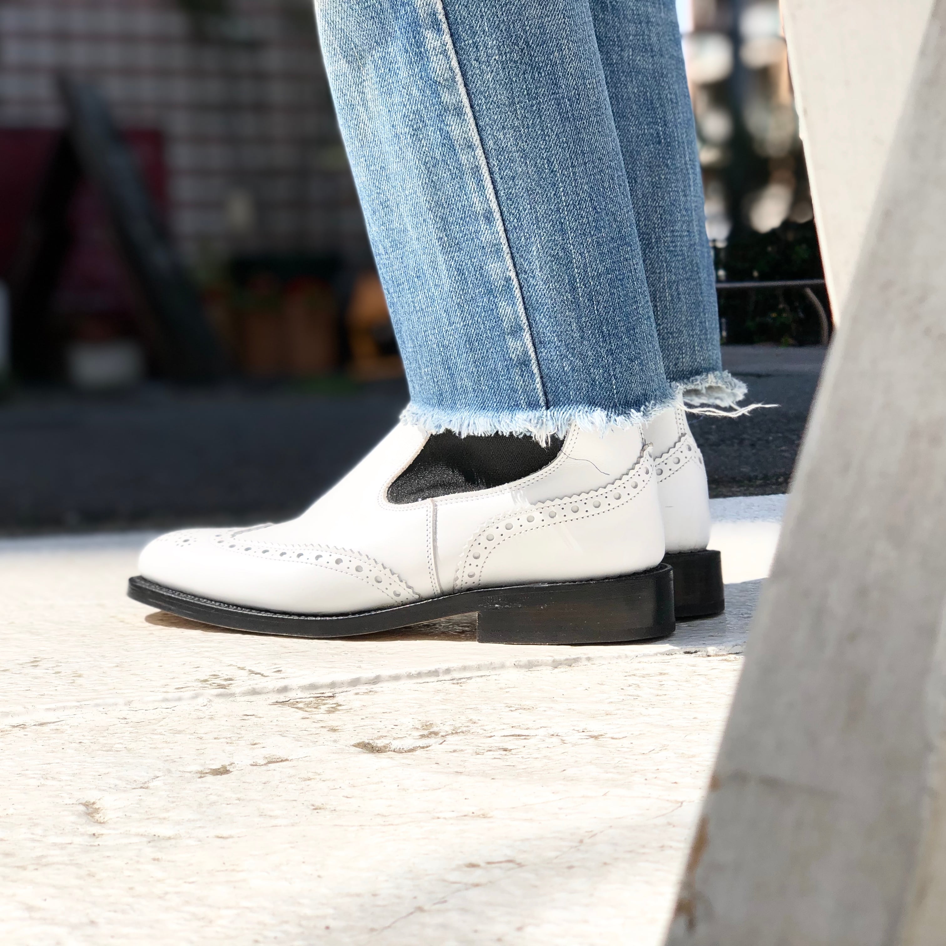 形は日本で言う「サイドゴアブーツ」。サイドゴアブーツですが発祥はイギリスのチェルシーという街のため、一般的に「チェルシーブーツ」と呼ばれています。特徴は、靴紐が ないので、甲のあたりがすっきりとしていて、ゴツくならずにスマートな印象です。メダリオンという装飾が全体に施されています。メダリオンは小さい丸い穴の装飾のことで、昔は通気性の機能のものだったらしいです。その昔、英国紳士は自分のイニシャルを入れ、職人はメダリオンの美しさを競ったそうです。