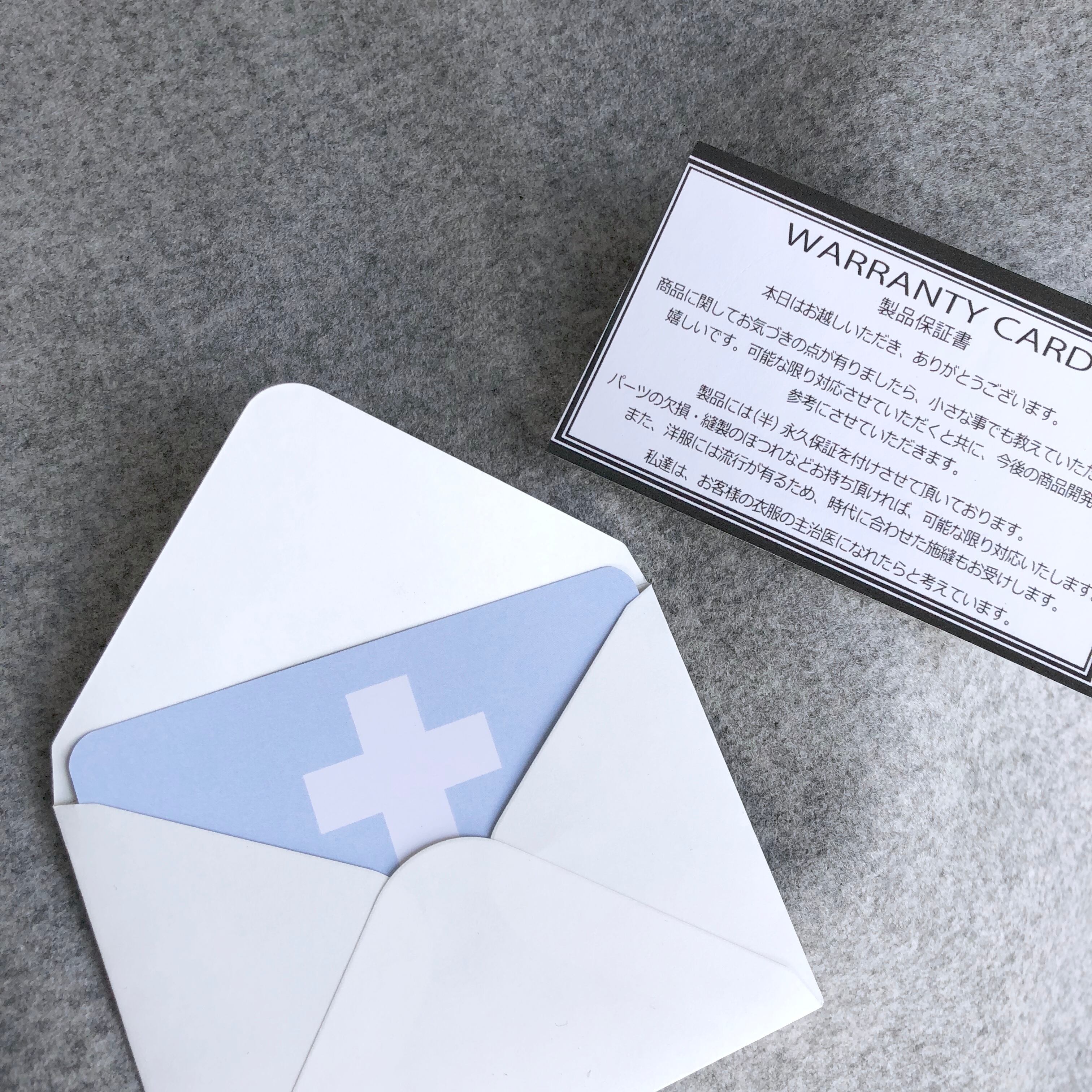 製品には、永久保証カードを同封させて頂いきます。それはANALOG LIGHTING OFFICEから皆様への信頼の証です。パーツの欠損・縫製のほつれなどお持ち頂ければ可能な限り対応いたします。また、洋服には流行があるためトレンドに合わせた施縫も受けております。私達は、お客様の衣服の主治医になれたらと思います。お気に入りになるまでお付き合いさせていただきますのでご連絡下さい。