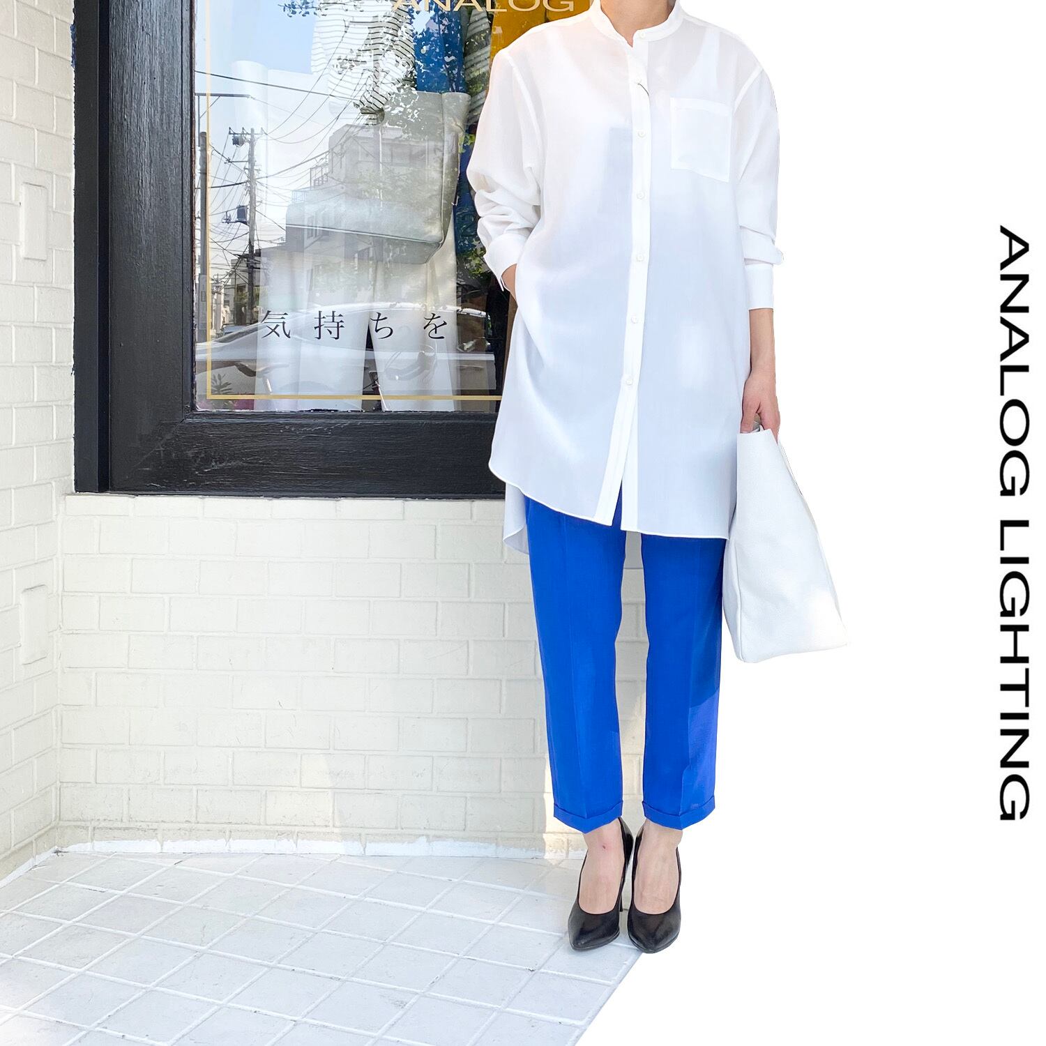 これを着れば、他は気にしなくていいと思えるアイテムにしています。主役級のアイテムを着る時、他はシンプルにするのが一番センスが良く決まります。カラーだけど目立ちすぎない、洋服として日常に馴染む色を探しました。合わせるトップスやアウターの色はホワイト、ブラック、ネイビーの定番色で十分です。ベージュなども肌と同系色になるので馴染みます。トップスを選ばない形のため、とても便利なアイテムです。特に白シャツやジャケットなど、シンプルなトップスなどをお勧めいします。ヒールはもちろんですが、カジュアルなスニーカースタイル + スタンダードなTシャツでもバランス良くすっきりと見せてくれます。