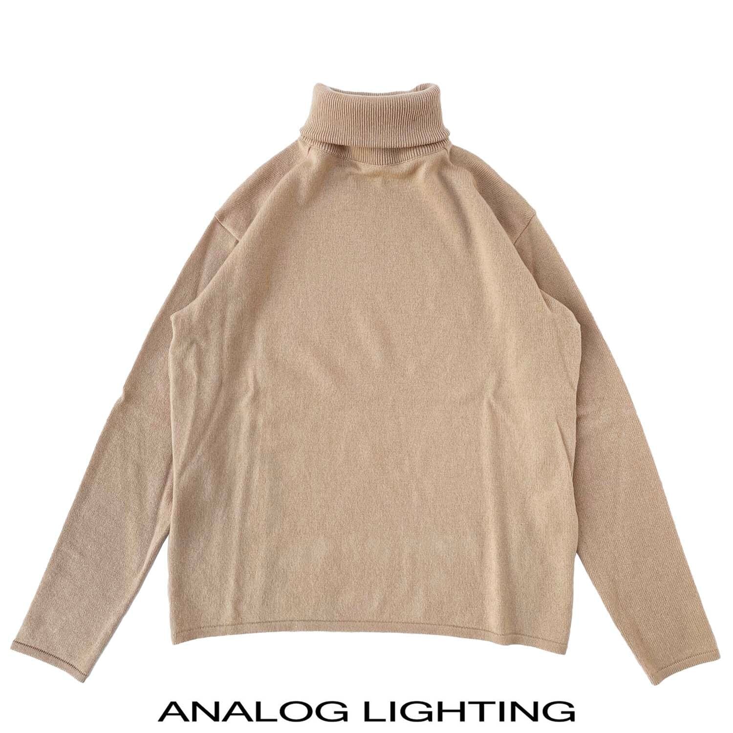 薄手のタートルネックセーターでいつも思っていたことがあります。ネック部分がキレイに立ち上がる網み目にすると、身体部分の網み目が荒くなってしまいます。身体部分に合った繊細な網目にすると、今度はネック部分が頼りなくなってしまいます。なので、ネック部分と身体部分を別の機械で編んで、少し強引にリンキングという機械でつなげました。さらにマルロンというストレッチ糸を間隔をあけて入れています。入れすぎると質感が安っぽくなるマルロンですが、程よく抑えるとしっかり感が生まれます。カシミアが気持ちいいのは糸の細さもあるのですが、天然のキューティクルが糸表面を覆っていることもあります。チクチクが嫌な方も解決です。首がピッタリ過ぎすると昔っぽくなったり、堅い印象になるので程よくゆったりしているのがポイントで 「大人のタートルネックセーター 注意ポイント=」 です。コンパクトで華奢な印象ですが、アームホールは意外と大きめで、見た目以上に体型を選ばないので、より多くの方がトライできるシルエットとなっております。 デザインはシンプルですが肩の縫い目を前にずらしているのが密かなポイントです。 こうすると、縫い目のゴロつきが気にならなくなるのと同時に、肩周りがコンパクトに見える華奢見え効果があります+ 地味なポイントなのですが、こういうちょっとした工夫の積み重ねが、全体の「なんかいいね!」につながると思っています。糸は日本の紡績メーカーでケミカルな柔軟剤などを一切使わない東洋紡糸さん。編みは山形の職人さんにお願いして編んでいただきました。