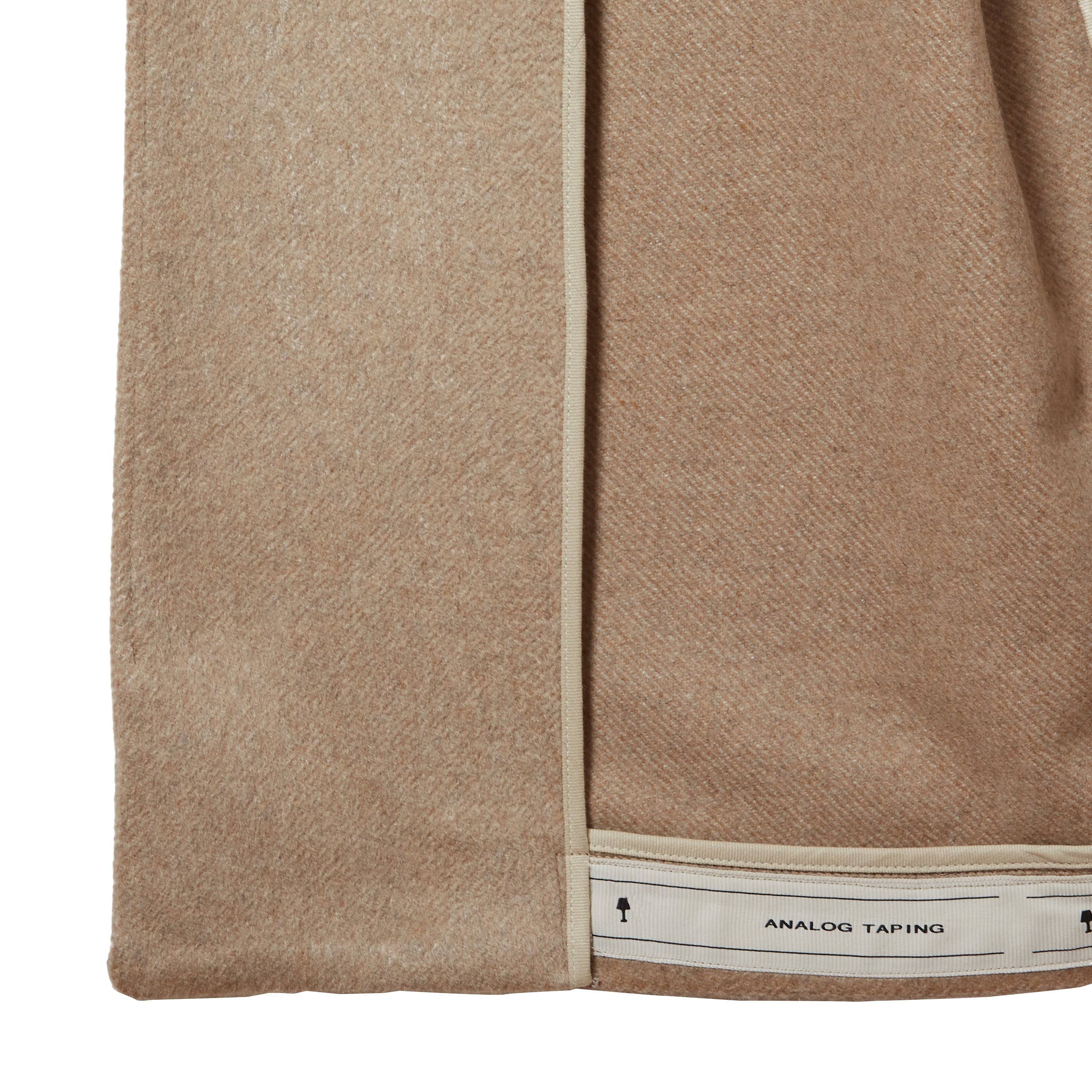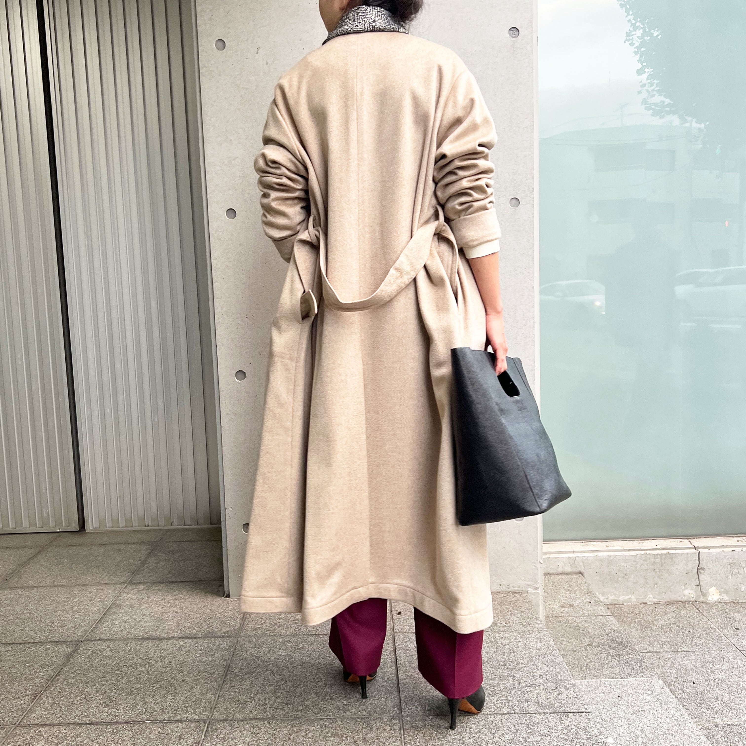 私たち定番のロングコートのノーカラーモデルが今年登場しました。素材はイタリアCOLOMBO社の目の詰まったカシミヤ100%のコート生地を使用しています。表面の毛並みを整えるウェーブがある、見るからに上質な質感のため、衿も無くしたシンプルなデザインにしました。時間を掛けて探して買ったコートでも、数年で着れなくなるともったいないですよね。安いコートを2〜3年ごとに消費し続ける暮らしよりも、質の良いコートを大切に長く着る暮らしを提案しています。そのため、細部に細かい手仕事を入れています。