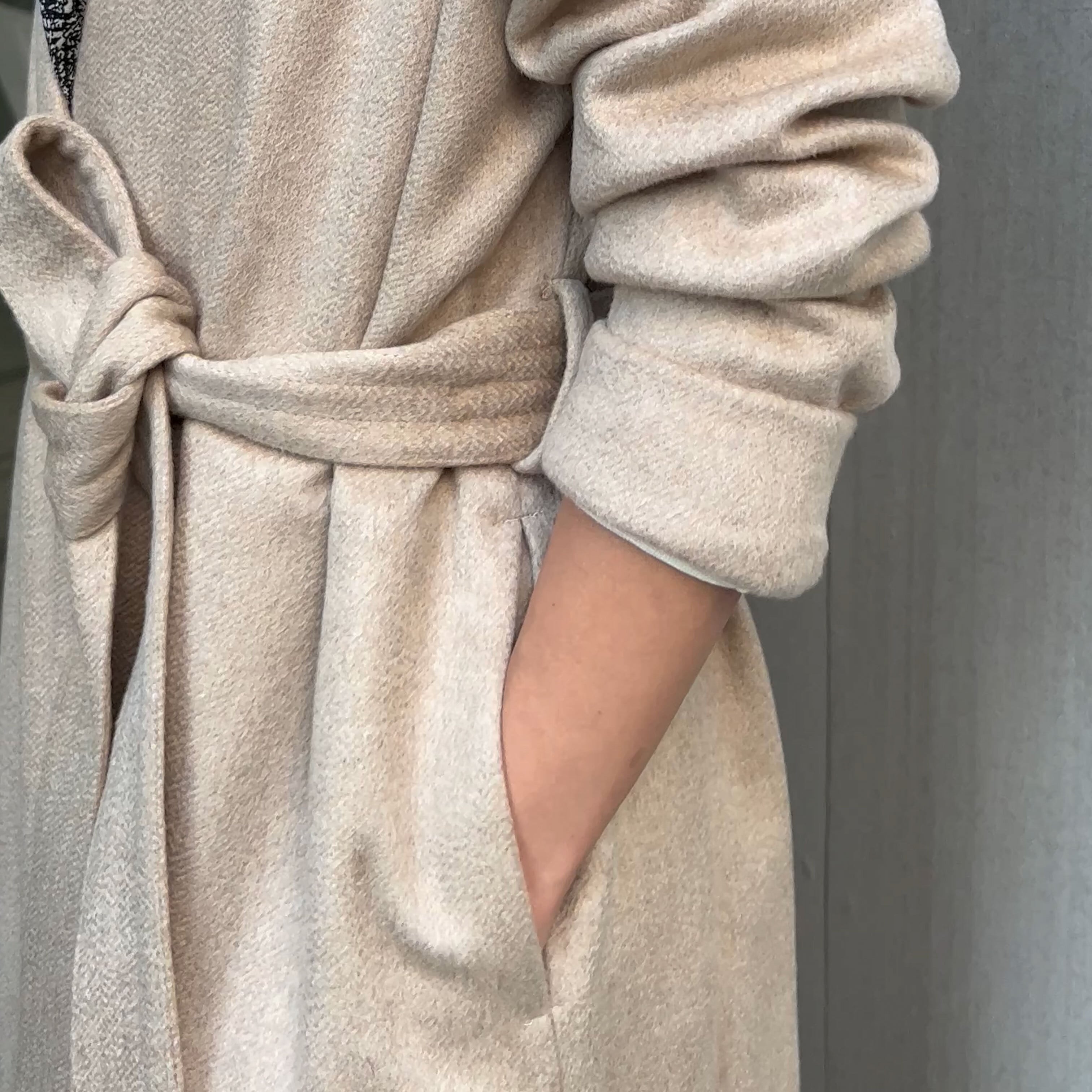 袖口 : 内側にも表の生地を使っています。これにより自由に折り返せるため、腕の長い方から短い方までサイズが合せられます。ジャケットやコートで補正が一番多いのが袖丈ですが、このコートは誰にでも合わせられつつも、デザインとしても素敵なので取り入れました。また、袖口は意図的に細くしています。インナーと一緒にたくし上げて、ヒジで止める事が出来るようにしたもので、腕が長く見え、スタイルが良く見えます。