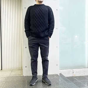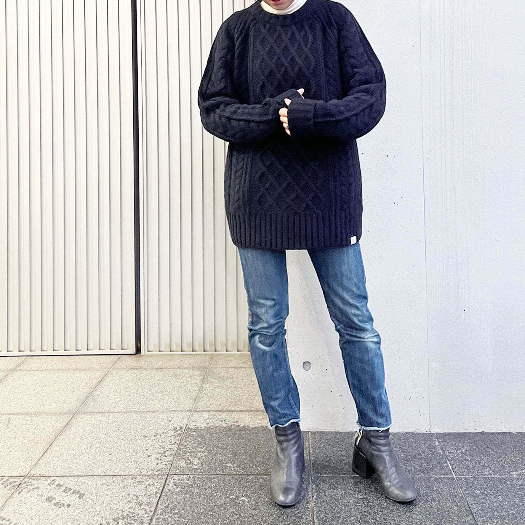 独特のヌメリ感が有ります。今までのケーブルニットにはない「滑るような」触り心地を体感していただきたいです。