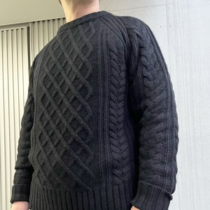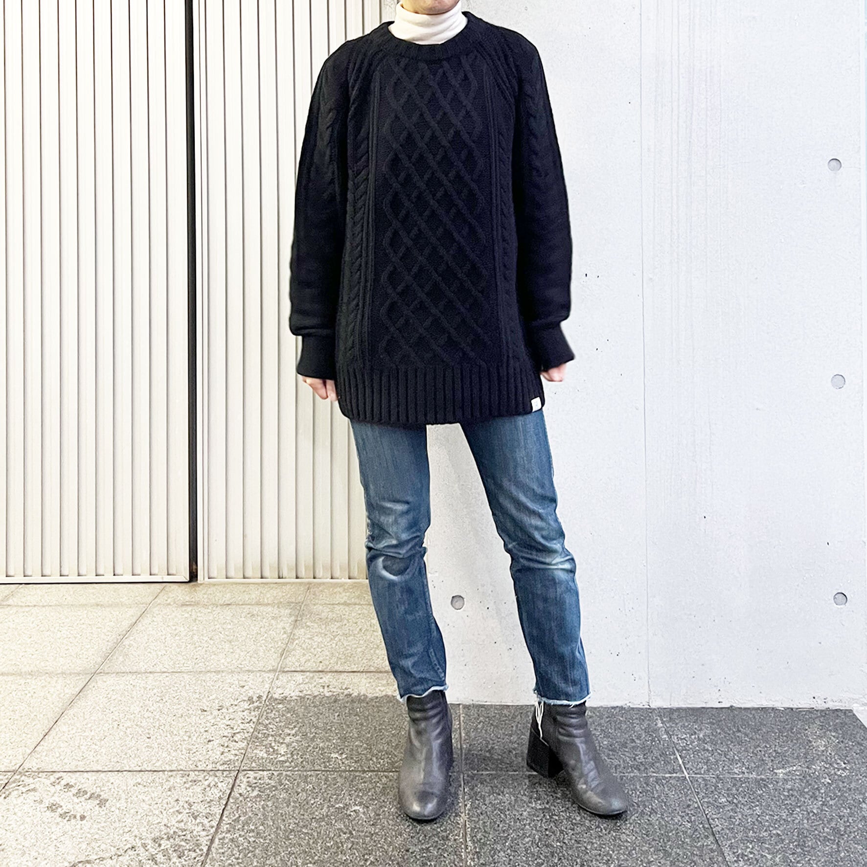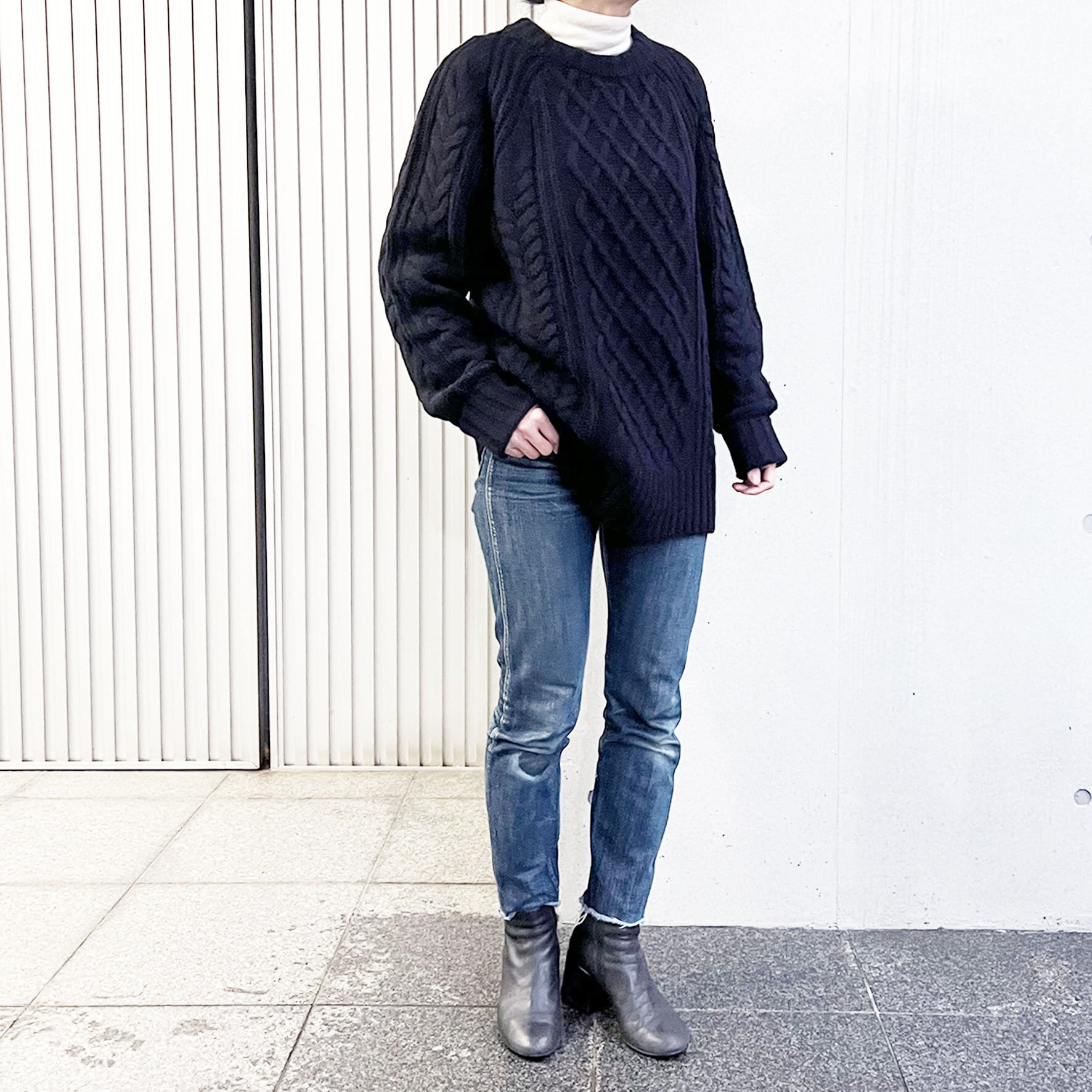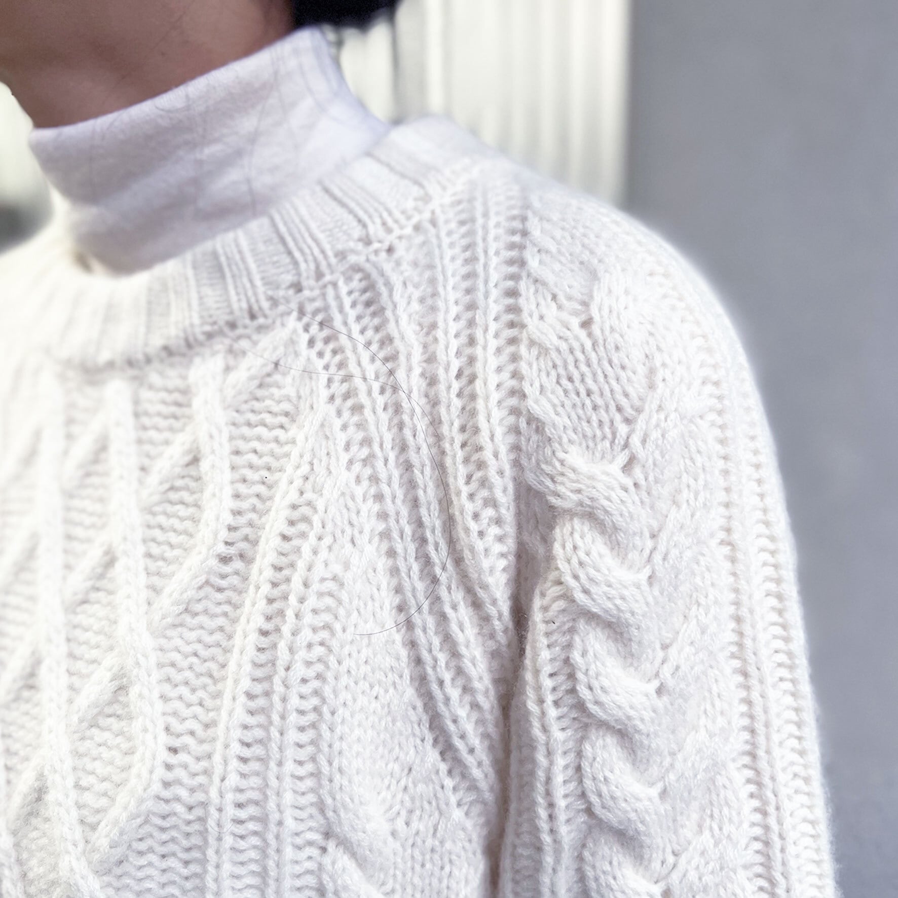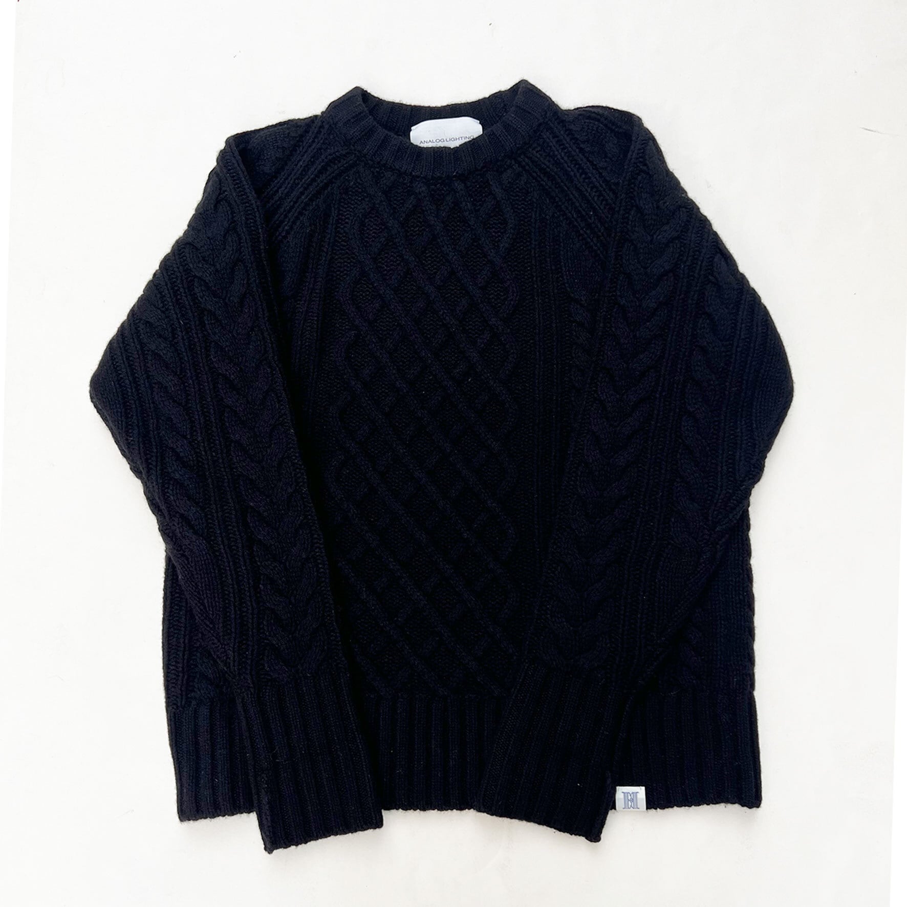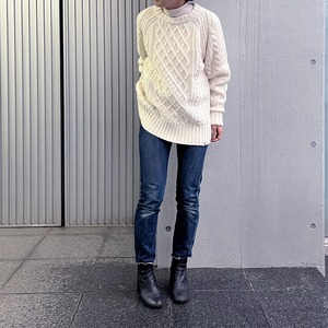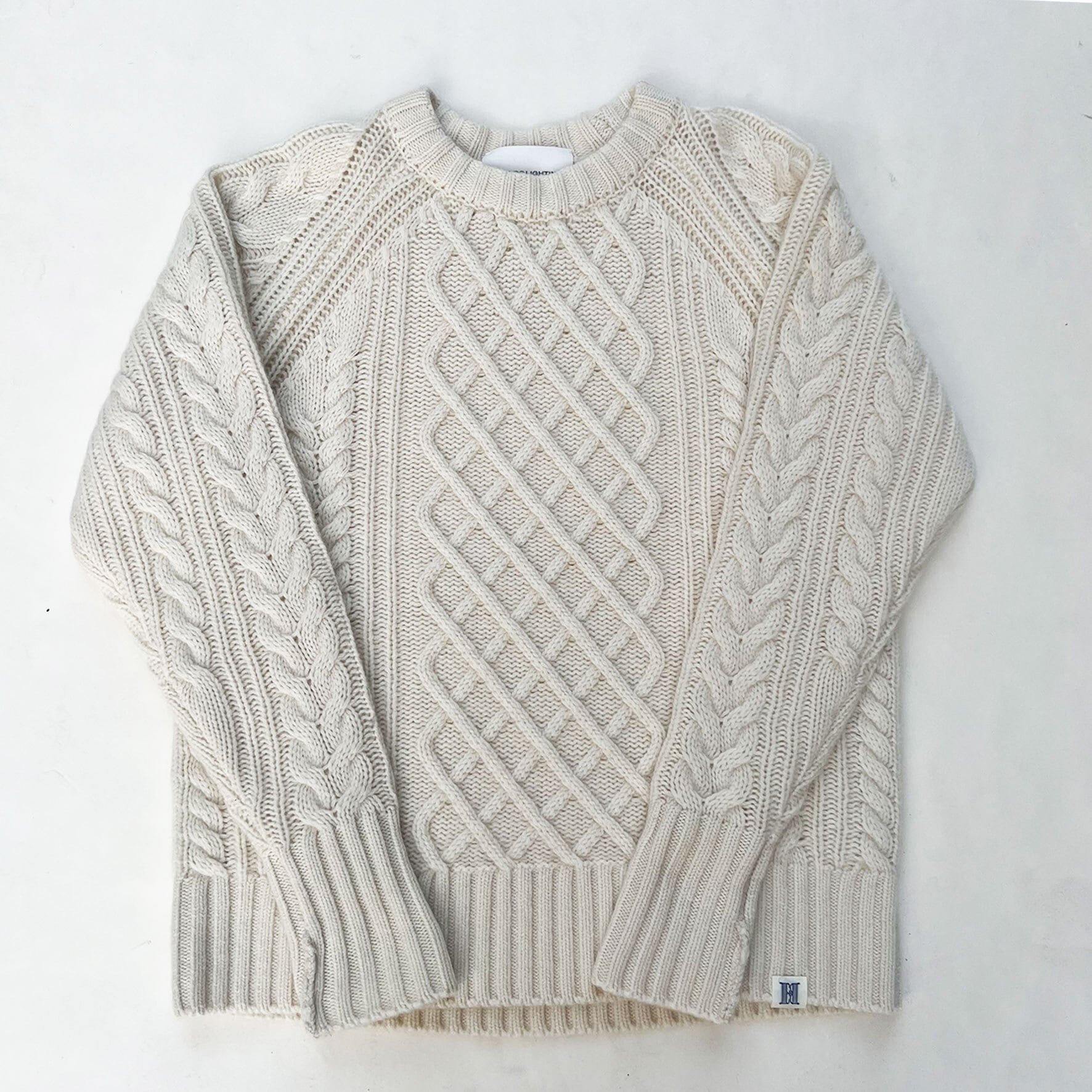 カシミヤ製のケーブルセーターです。「ケーブルセーターは着たいけど、本格的なモノ程重い、ゴワつく」という常識を打ち破る軽さと柔らかさを持っています。