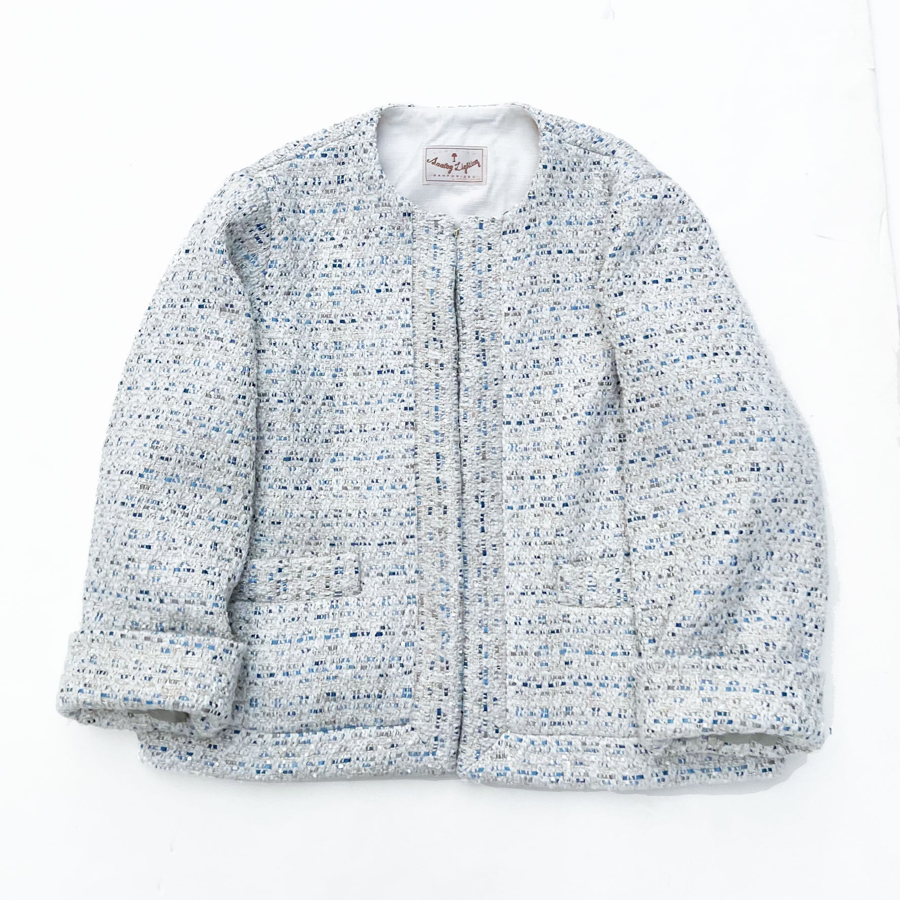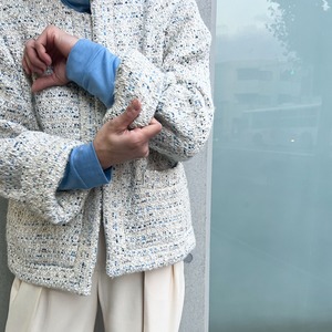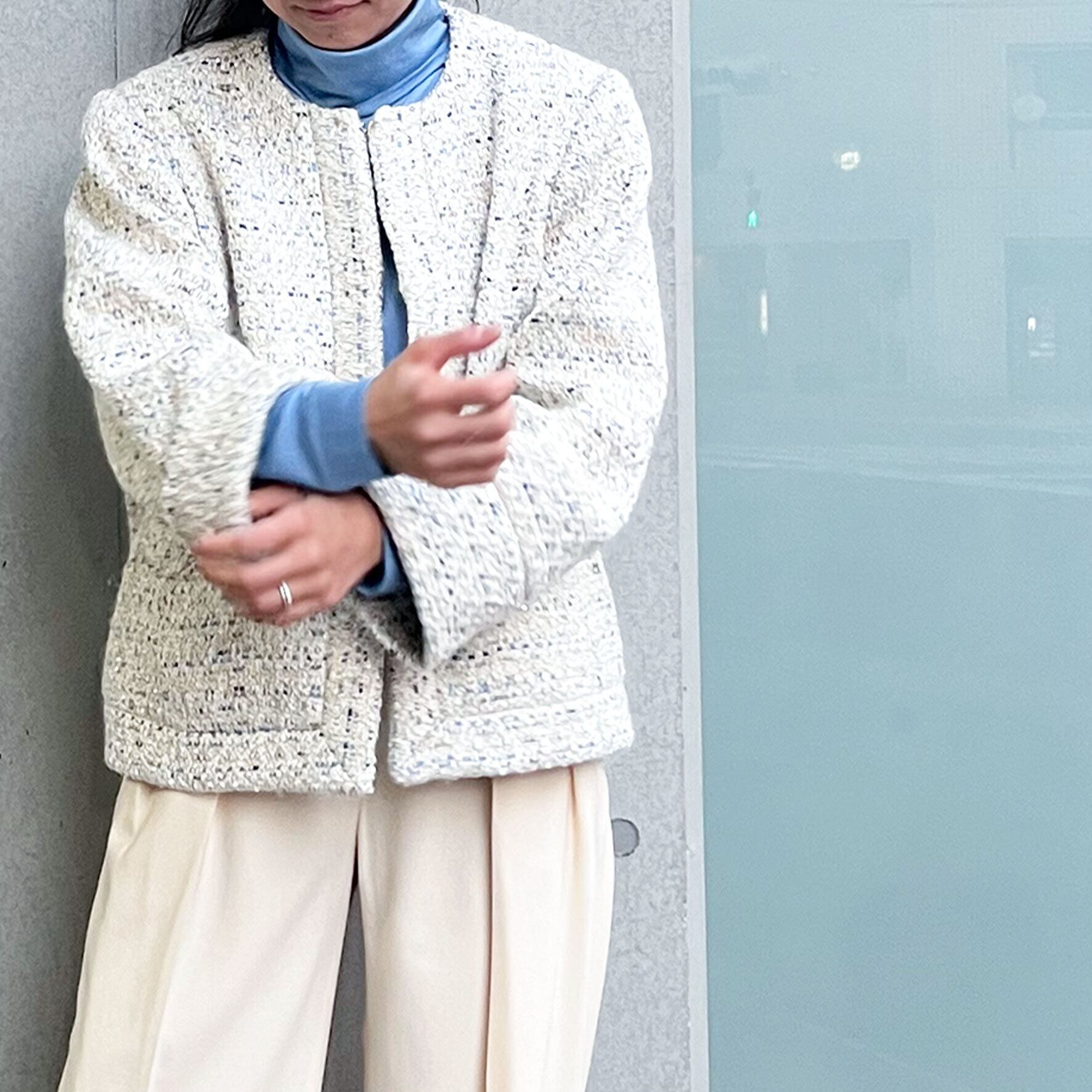 サックスカラーがアクセントのツイードジャケット。ツイードならではの華やかさが着る人を明るくさせてくれます。