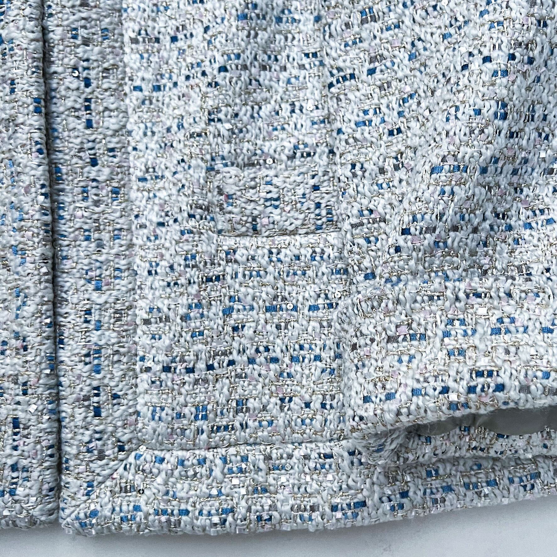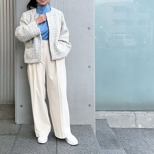 ホワイトベースのツイードにゴールドラメとサックスがアクセントのあるツイード素材を使用しています。